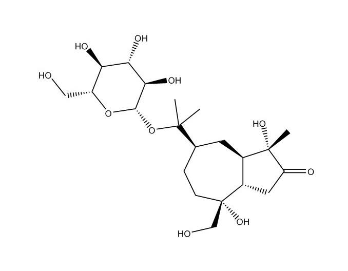 【英文別稱】 (1S,3aβ,8aα)-1-Methyl-1α,4α-dihydroxy-4-(hydroxymethyl)-7β-[1-methyl-1-(β-D-glucopyranosyloxy)ethyl]decahydroazulene-2-one